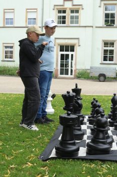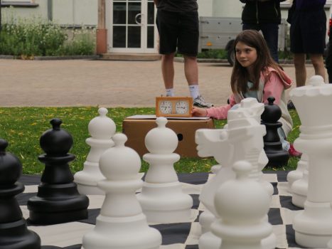 Der Spaß kam dabei nie zu kurz: Schach zu dritt, zu viert und hin und wieder auch Würfelschach standen ebenso auf dem Programm. An wärmeren Tagen spielten wir draußen auf dem Schulhof mit dem Großfeldschach. Und ja – selbst der erfahrenen Trainerin kann da im Gewusel der Figuren schon mal der Überblick verloren gehen.