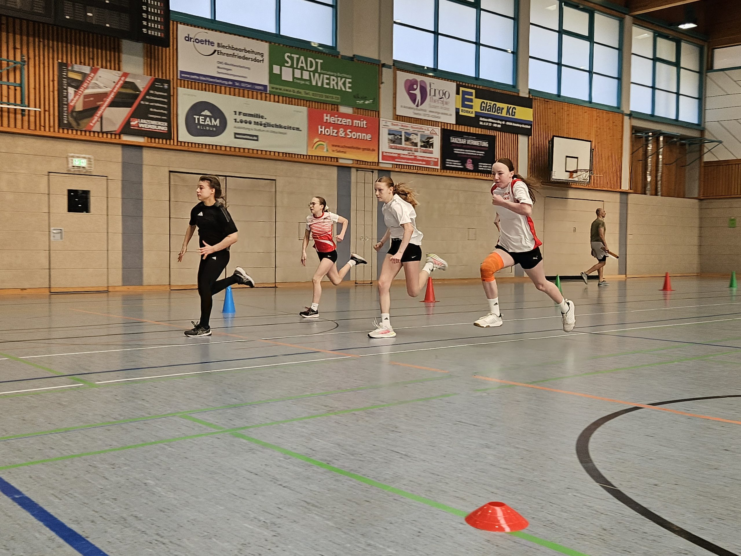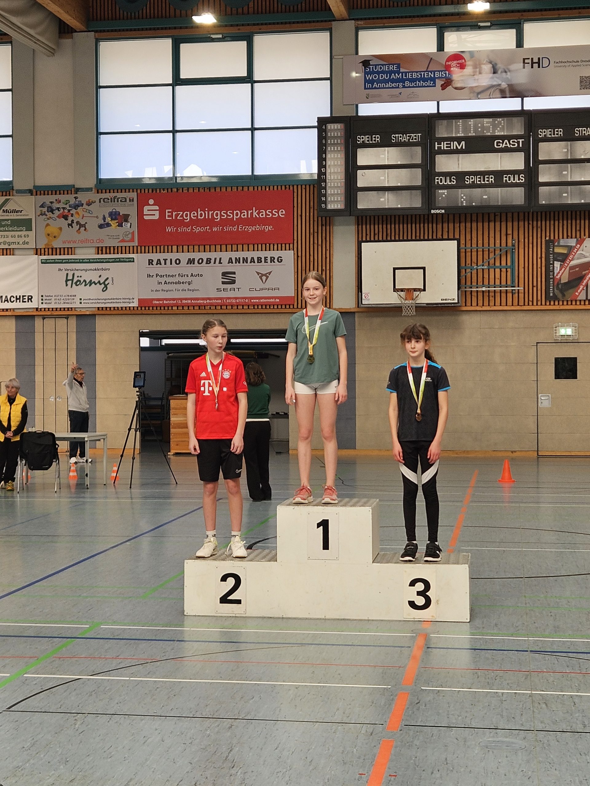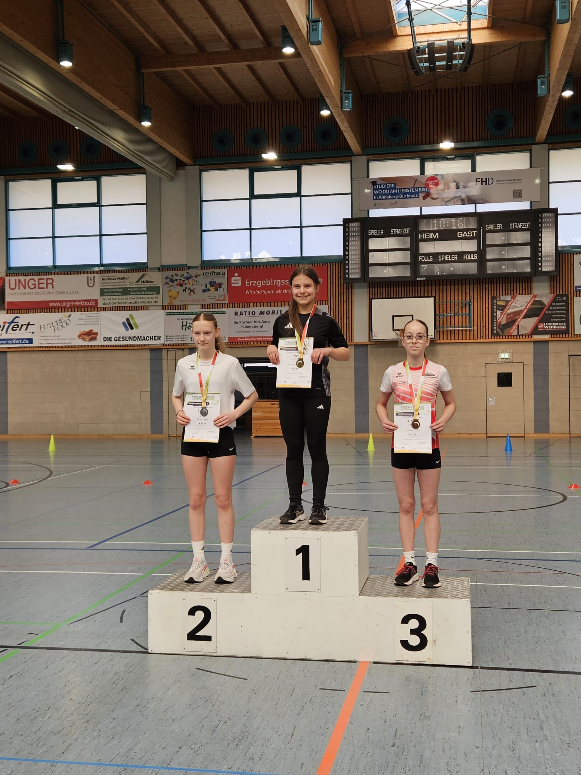 Die Mädchen des HGGT konnten insgesamt 8 Medaillen mit nach Thum nehmen. In der AK 11 gewann Anni Reuter den 1. Platz im Medizinballschocken sowie den 3. Platz im Dreierhopp. Im Sprint musste sie sich mit einem Abstand von nur einer Hundertstelsekunde mit dem undankbaren 4. Platz zufriedengeben. Eine Altersklasse über ihr gewann Kim Hunger in der AK 12 gleich zwei Goldmedaillen. Im Sprint und im Rundenlauf lief sie schneller als ihre Konkurrentinnen. Auch Kaisa Heidler (AK 13) stand gleich mehrmals auf dem Siegerpodest. Sie erreichte den 2. Platz im Medizinballschocken und den 1. Platz im Dreierhopp und im Sprint. Hierbei konnte sie ihren Rekord vom letzten Jahr bestätigen und rannte auch diesmal schneller als jedes andere Mädchen an diesem Tag! Im Dreierhopp stand Kaisa zusammen mit ihrer Teamkollegin Amelie Päßler auf dem Podest: Sie belegte den 3. Platz.