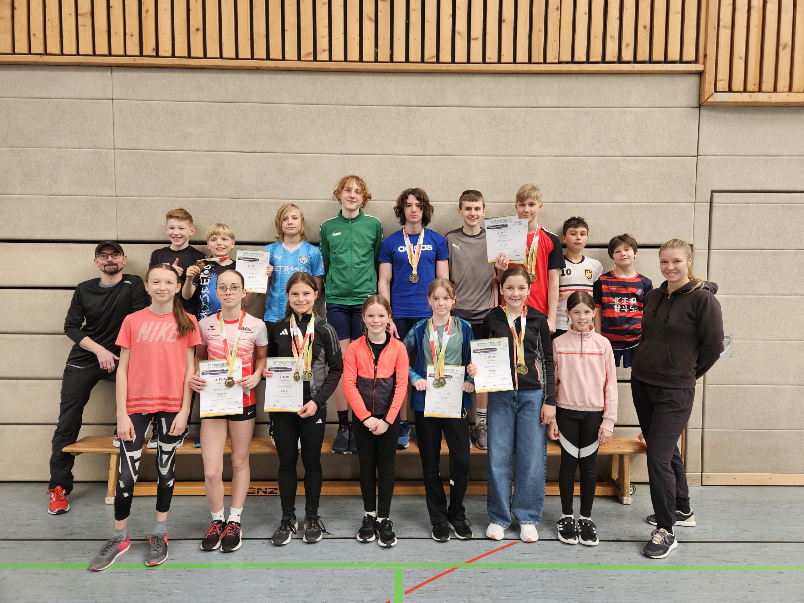 Bei den Jungen konnte sich Paul Kröher in der AK 11 den 3. Platz im Rundenlauf sichern. Gleich drei Medaillen holte sich Louis Reichenbach (AK 13). Er erreichte den 2. Platz im Sprint und den 1. Platz im Medizinballschocken und im Rundenlauf. Lediglich im Dreierhopp musste er sich um 1cm mit dem 4. Platz geschlagen geben. Ähnlich erfolgreich war Nick Mehlhorn (AK 15). Er holte sich die Silbermedaille in den Disziplinen Sprint und Dreierhopp sowie die Goldmedaille im Kugelstoßen. Glückwunsch allen Teilnehmern für ihre Leistungen!