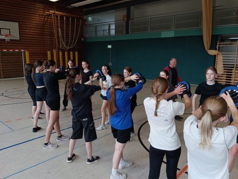 Mit einer abwechslungsreichen Mischung aus Übungen zum gezielten Einsatz von Mimik, Gestik und Sprache sowie grundlegenden Griff-, Schlag- und Tritttechniken trainierten die 10.Klässler selbstbewusstes Auftreten und effektive Methoden zur Verteidigung im Falle eines körperlichen Übergriffs. Zudem verdeutlichte Herr Päckert mit vielen spannenden Beispielfällen, dass immer das oberste Ziel sein sollte, Gewalt zu vermeiden und bereits ein entschlossenes, selbstsicheres Auftreten sehr hilfreich sein kann. Insgesamt ein sehr informativer und gelungener Projektsamstag!